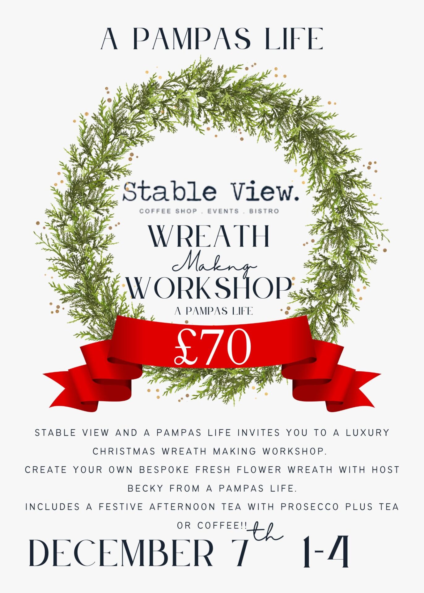 Join me on Sunday the 7th of December at the stable view, where I will guide you step by step to create your own Christmas wreath, making a perfect decoration for your festive front door!!