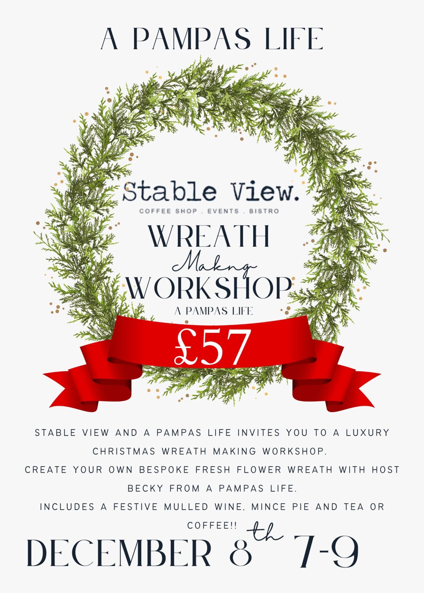 Join me on Monday the 8th of December at the stable view, where I will guide you step by step to create your own Christmas wreath, making a perfect decoration for your festive front door!!