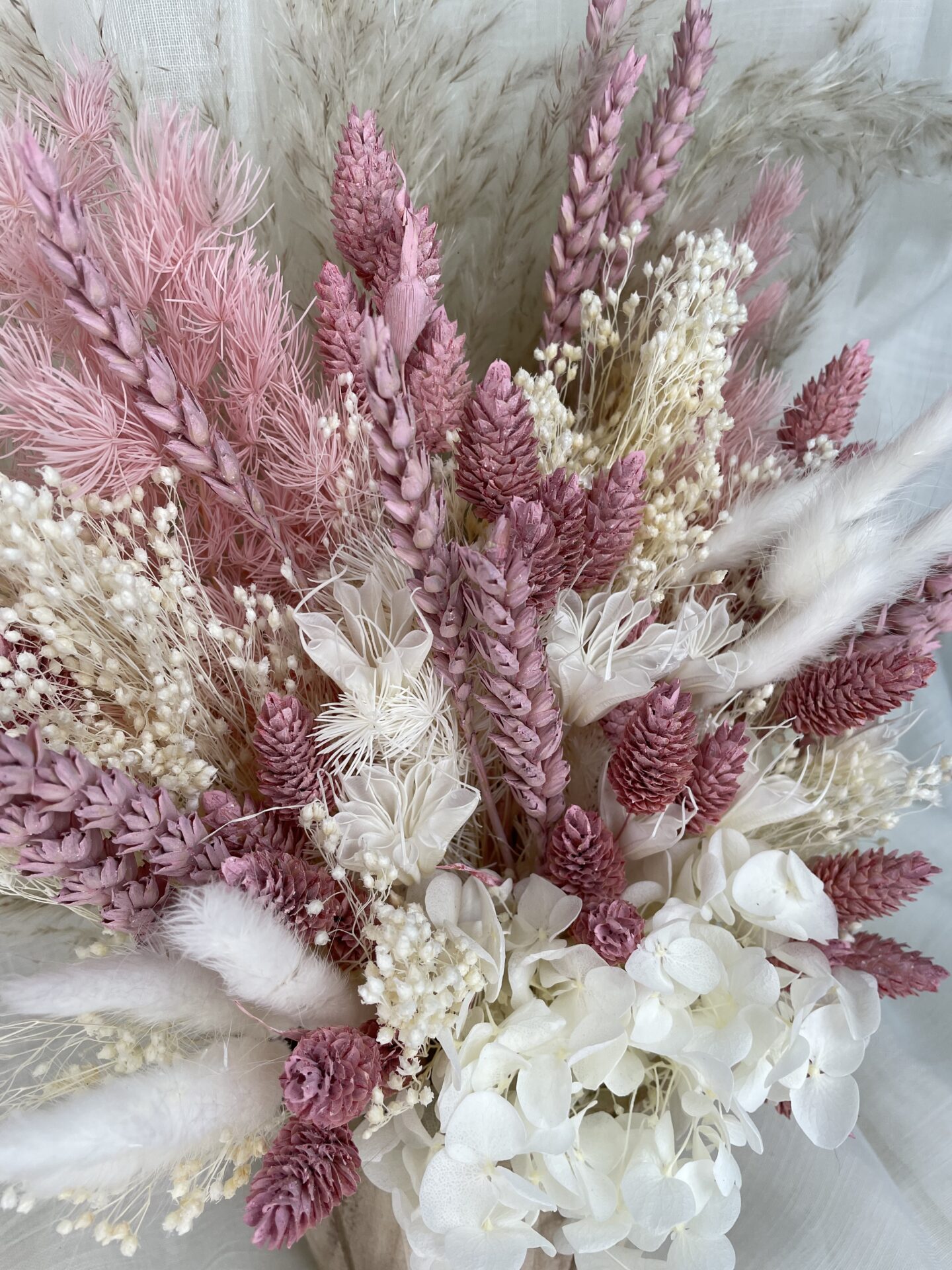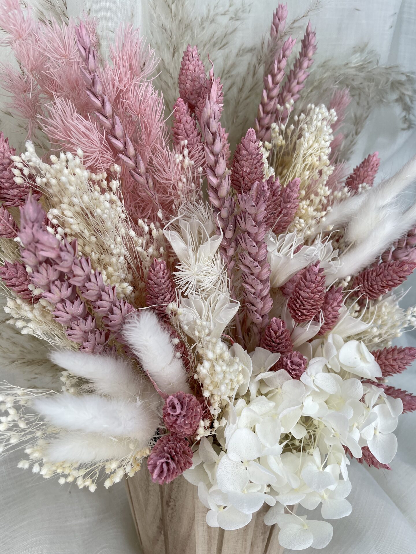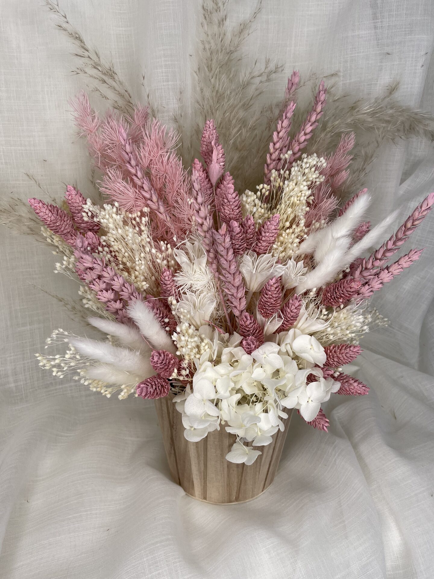 Our pink pampas bucket is a perfect choice for those who are just as obsessed with dried flowers as we are, its pick tones and wooden bucket style pot, make this pampas pot a perfect additional to any home decor.