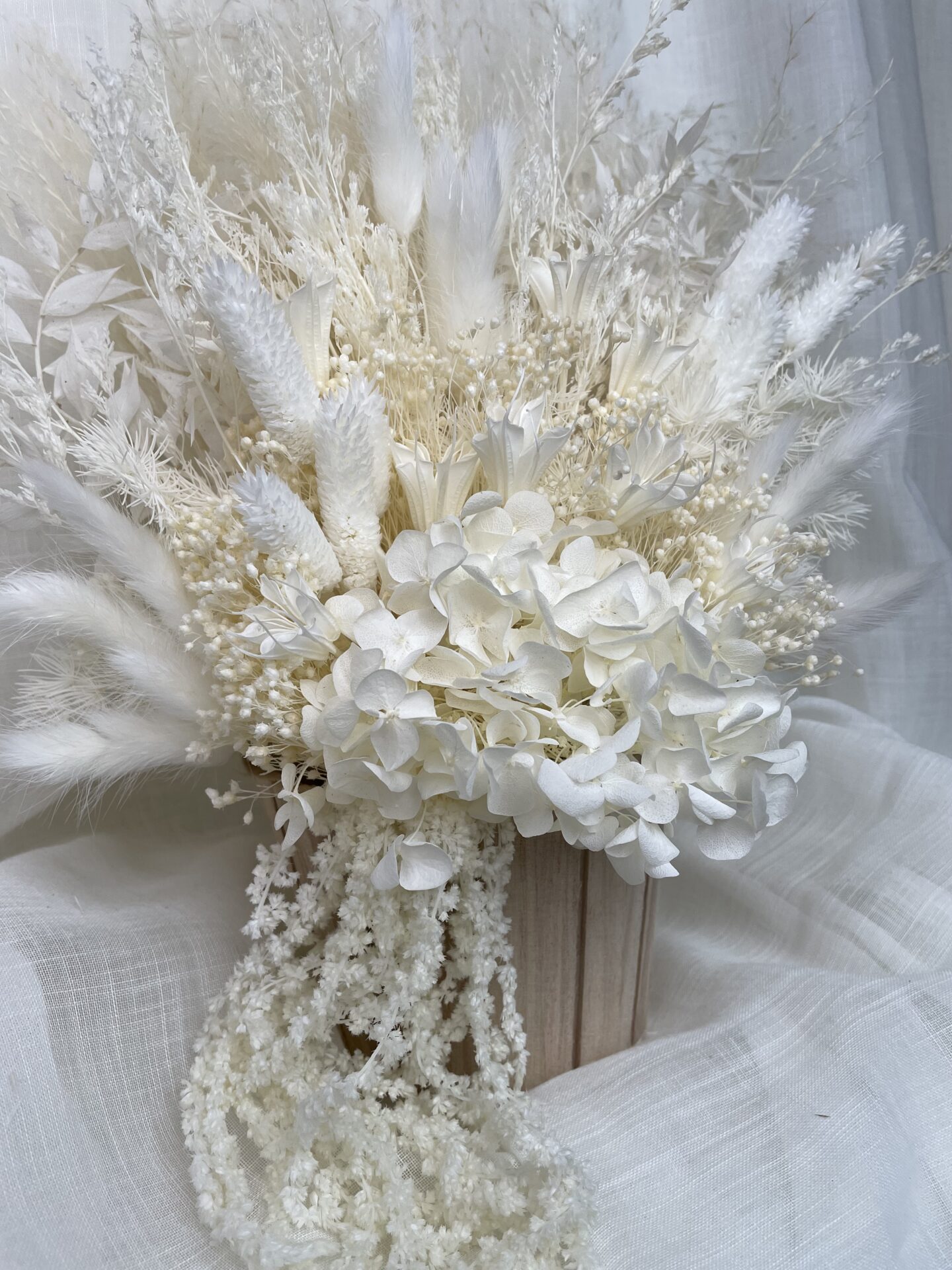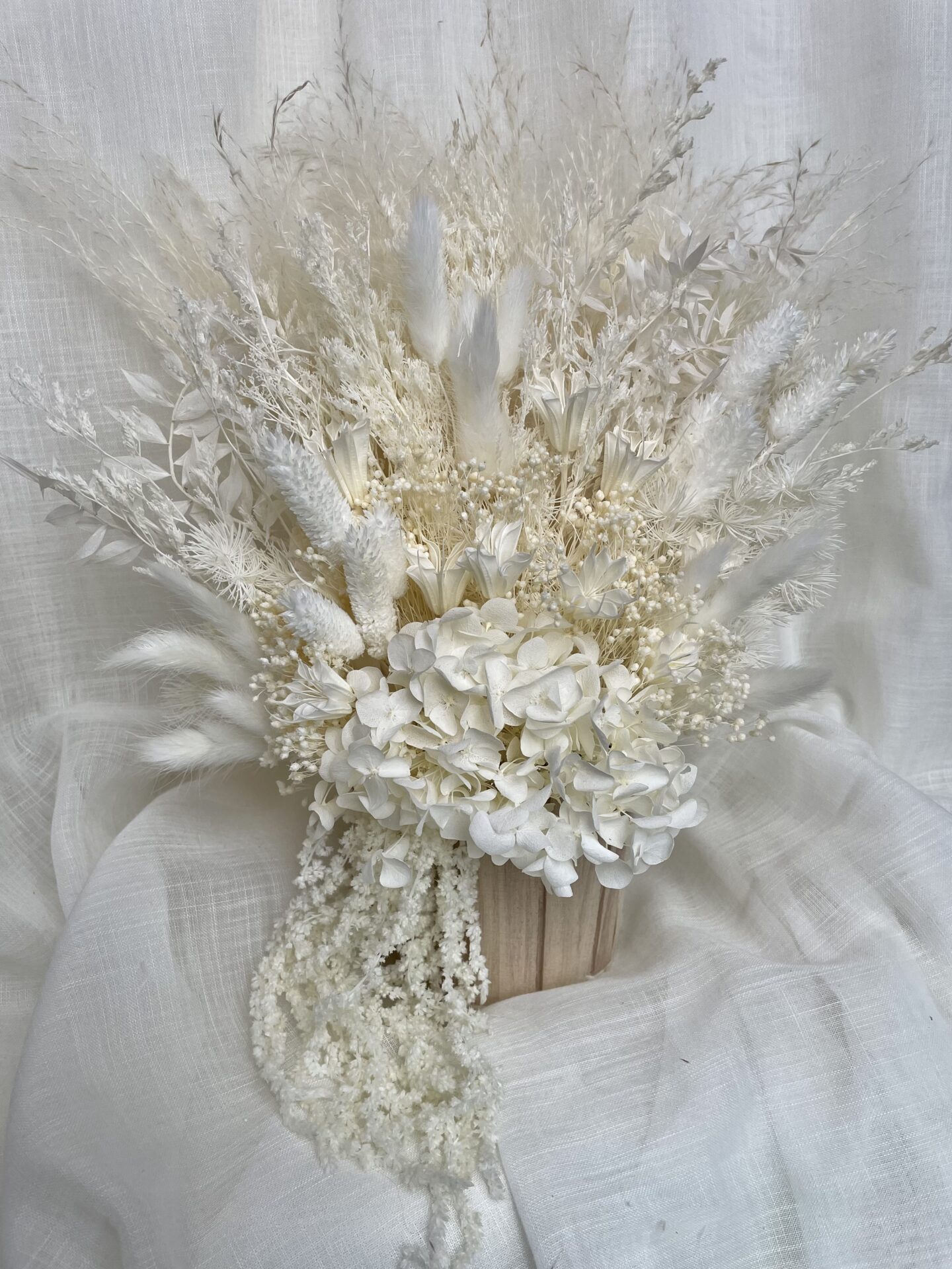 Our white pampas bucket is a perfect choice for those who are just as obsessed with dried flowers as we are, its mixture of white and creams tones tones with its wooden bucket pot, make this pampas pot a perfect additional to any home decor.